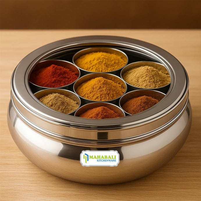 The Mahabali Stainless Steel Orange Masala Dabba with See Through Lid is a traditional Indian spice box created by the brand Mahabali, known for curating high-quality Indian masalas (spices). Its transparent lid allows for quick identification of contents without opening the container, saving time and keeping your kitchen organized. A Mahabali Stainless Steel Orange Masala Dabba with See Through Lid is a round container, usually stainless steel, that holds several small bowls, each filled with a different spice commonly used in Indian cooking. It consists of seven separate removable stainless-steel cups and a small utility spoon. Other than spices, it can be used for your favorite herbs, dry fruits, and ingredients that you personally like to use in your daily cooking.