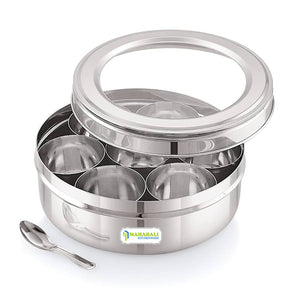 The Mahabali Stainless Steel Neelam Masala Dabba with See Through Lid is a traditional Indian spice box created by the brand Mahabali, known for curating high-quality Indian masalas (spices). Its transparent lid allows for quick identification of contents without opening the container, saving time and keeping your kitchen organized. A Mahabali Stainless Steel Neelam Masala Dabba with See Through Lid is a round container, usually stainless steel, that holds several small bowls, each filled with a different spice commonly used in Indian cooking. It consists of seven separate removable stainless-steel cups and a small utility spoon. Other than spices, it can be used for your favorite herbs, dry fruits, and ingredients that you personally like to use in your daily cooking.